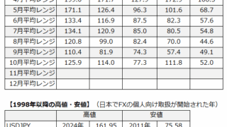 レンジデータ 平均レンジデータ更新しました(2025-10-18) 月ごとの平均レンジデータです。毎週月曜日のAM 6:15 頃に前週までの分を公開しています。年間、月間ともに日次データ(BID)からシンプルに算出しています。過去のレンジデータ(1998年~)はこちら 2025.10.20 レンジデータ
