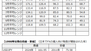 レンジデータ 平均レンジデータ更新しました(2025-10-25) 月ごとの平均レンジデータです。毎週月曜日のAM 6:15 頃に前週までの分を公開しています。年間、月間ともに日次データ(BID)からシンプルに算出しています。過去のレンジデータ(1998年~)はこちら 2025.10.27 レンジデータ