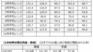 レンジデータ 平均レンジデータ更新しました(2025-11-08) 月ごとの平均レンジデータです。毎週月曜日のAM 6:15 頃に前週までの分を公開してます。年間、月間ともに日次データ(BID)からシンプルに算出しています。EURJPYは2025年11月12日に179.47円の最高値を更新。EURJPYは2... 2025.11.10 2025.11.15 レンジデータ