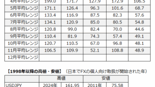 レンジデータ 平均レンジデータ更新しました(2025-11-22) 月ごとの平均レンジデータです。毎週月曜日のAM 6:15 頃に前週までの分を公開してます。年間、月間ともに日次データ(BID)からシンプルに算出しています。過去のレンジデータ(1998年~)はこちら 2025.11.24 レンジデータ