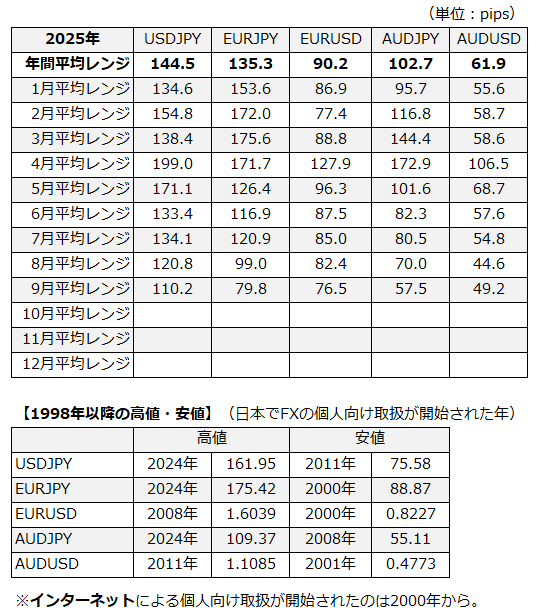 平均レンジデータ更新しました(2025-09-27) 2025.09.29 月ごとの平均レンジデータです。毎週月曜日のAM 6:15 頃に前週までの分を公開してます。 年間、月間ともに日次データ(BID)からシンプルに算出しています。 過去のレンジデータ(1998年~)はこちら