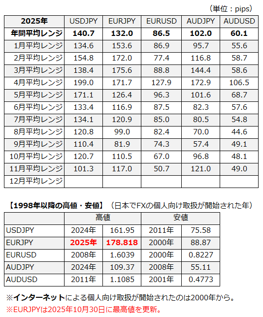 月ごとの平均レンジデータです。毎週月曜日のAM 6:15 頃に前週までの分を公開してます。