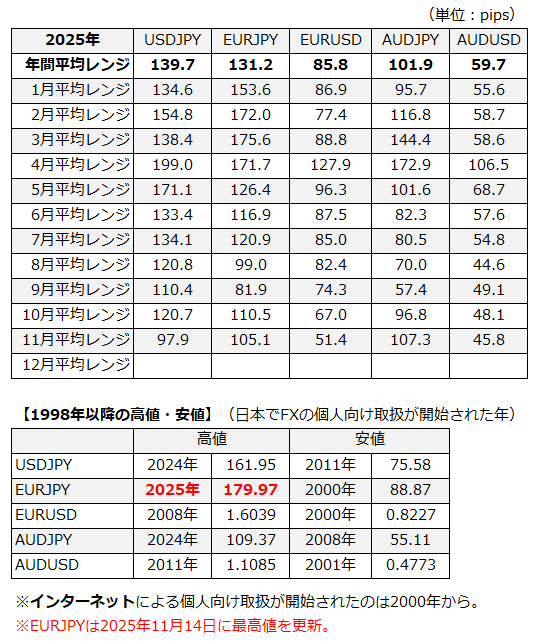 年間、月間ともに日次データ(BID)からシンプルに算出しています。
