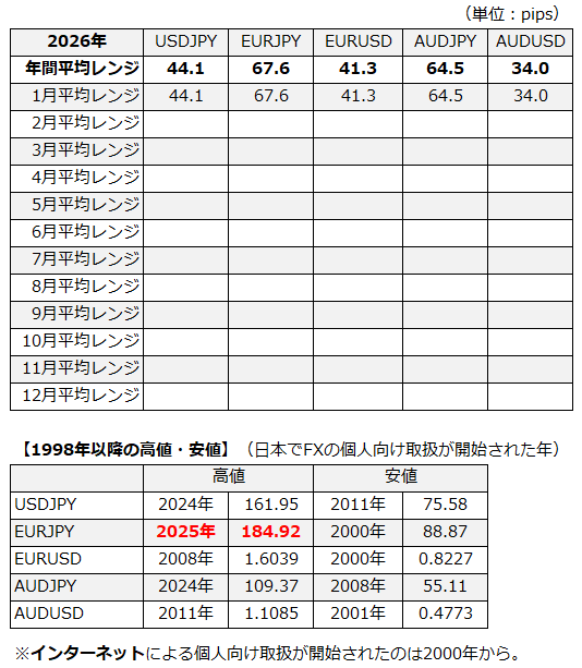 平均レンジデータ更新しました(2026-01-03) 2026.01.05 月ごとの平均レンジデータです。毎週月曜日のAM 6:15 頃に前週までの分を公開してます。 年間、月間ともに日次データ(BID)からシンプルに算出しています。 2026年 2025年 過去のレンジデータ(1998年~)はこちら