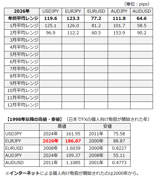 月ごとの平均レンジデータです。毎週月曜日のAM 6:15 頃に前週までの分を公開してます。