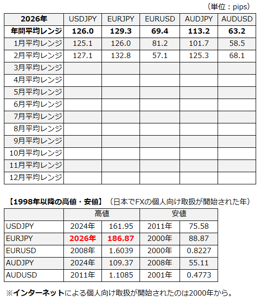 月ごとの平均レンジデータです。毎週月曜日のAM 6:15 頃に前週までの分を公開してます。